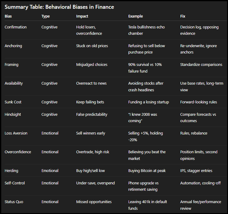- How to reduce it: Keep a decision journal, log disconfirming evidence, and pre-commit to exit rules.