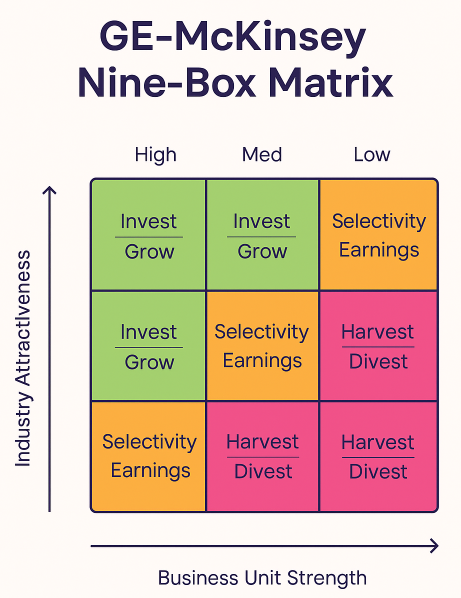 The McKinsey GE Matrix (also called the Nine-Box Matrix) was developed in the 1970s by McKinsey & Company for General Electric. GE needed a more sophisticated portfolio analysis tool than the simpler BCG Matrix, one that could evaluate multiple business units across diverse industries.
